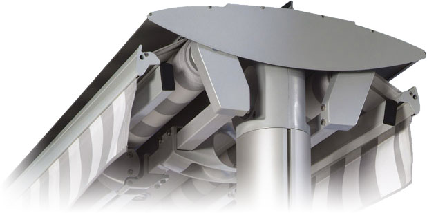 Die Gastro Sunrain spendet Schatten und kann auch bei Regen ausgefahren bleiben. Zur serienmäßigen Ausstattung gehört ein wasserdichtes Markisentuch aus einem Hochleistungsgewebe. Zwei Pfetten zur Unterstützung des Markisentuchs verhindern zuverlässig, dass sich Wasser auf dem Tuch sammelt. Der Wasserablauf ist bereits ab 5° Neigung gesichert.
