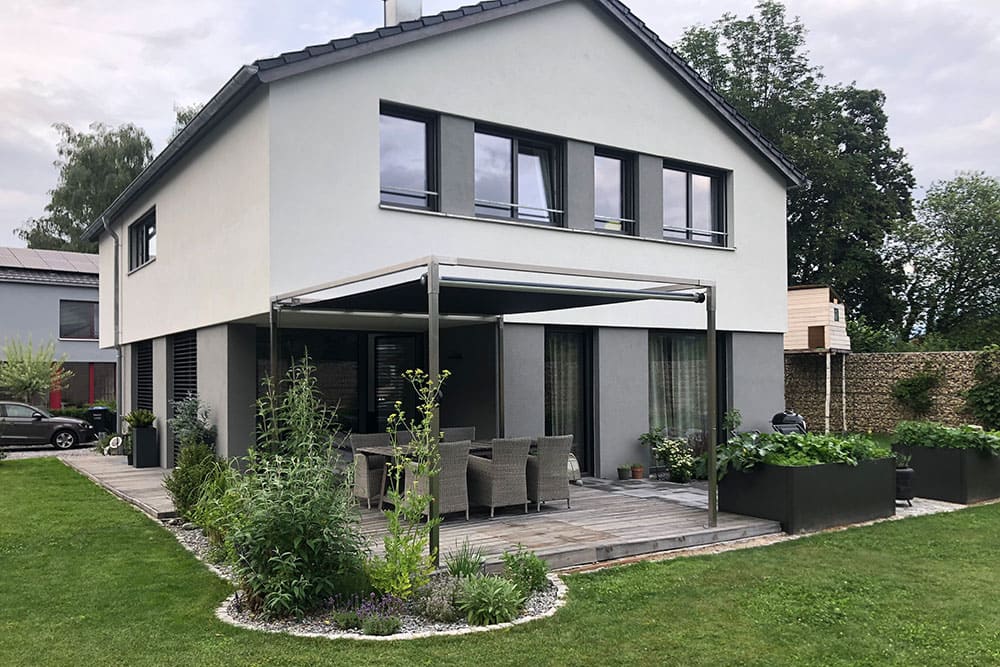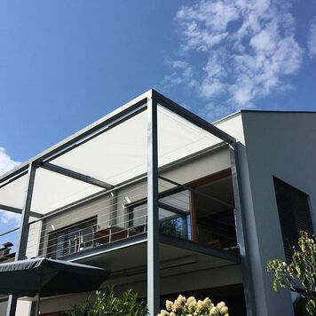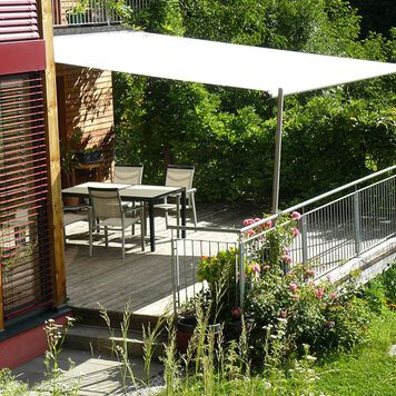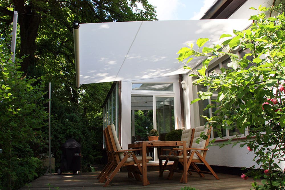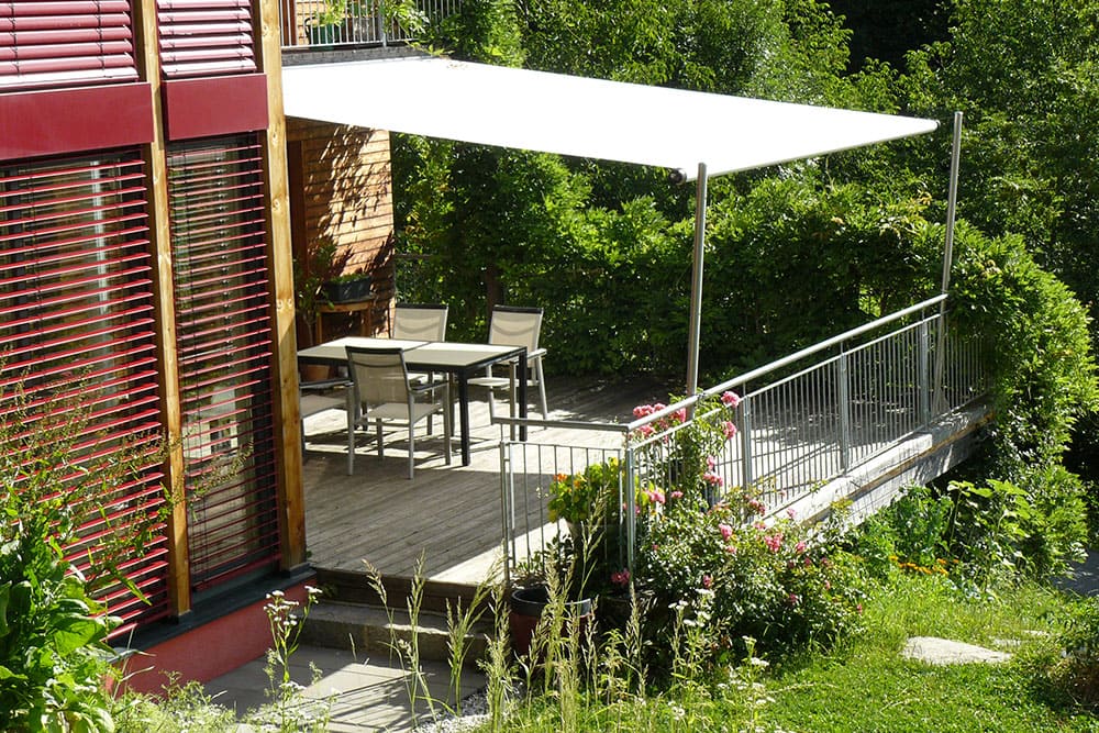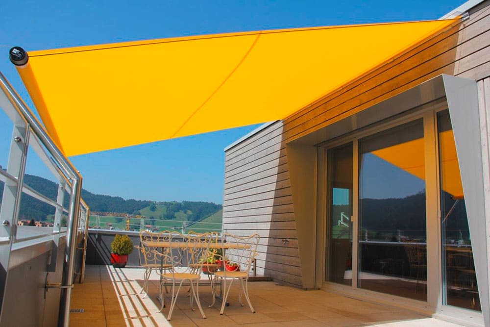 Die Segelmarkisen von Shadesign verbinden die leichte Anmutung eines Sonnensegels mit den Vorteilen komfortabler Markisen und verzcihten dabei auf mechanische Gestellstreben. Das schafft mehr Freiraum und wirkt eleganter.