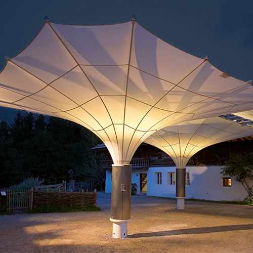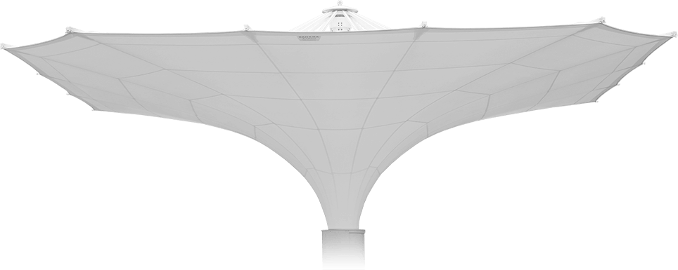 Largo ist ein Großschirm in eleganter Tulpenform. Er dreht das Prinzip Sonnenschirm um und versteckt Technik und wasserableitende Funktionen sehr geschickt im Inneren. Dies macht ihn technisch anspruchsvoll, aber umso ansprechender für ästhetische Bedürfnisse.