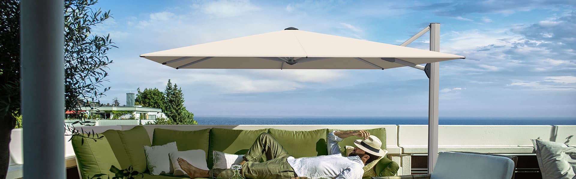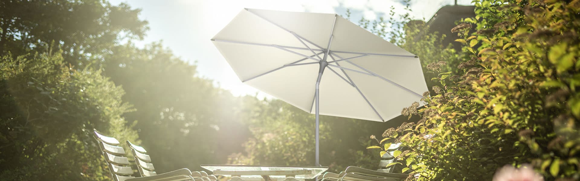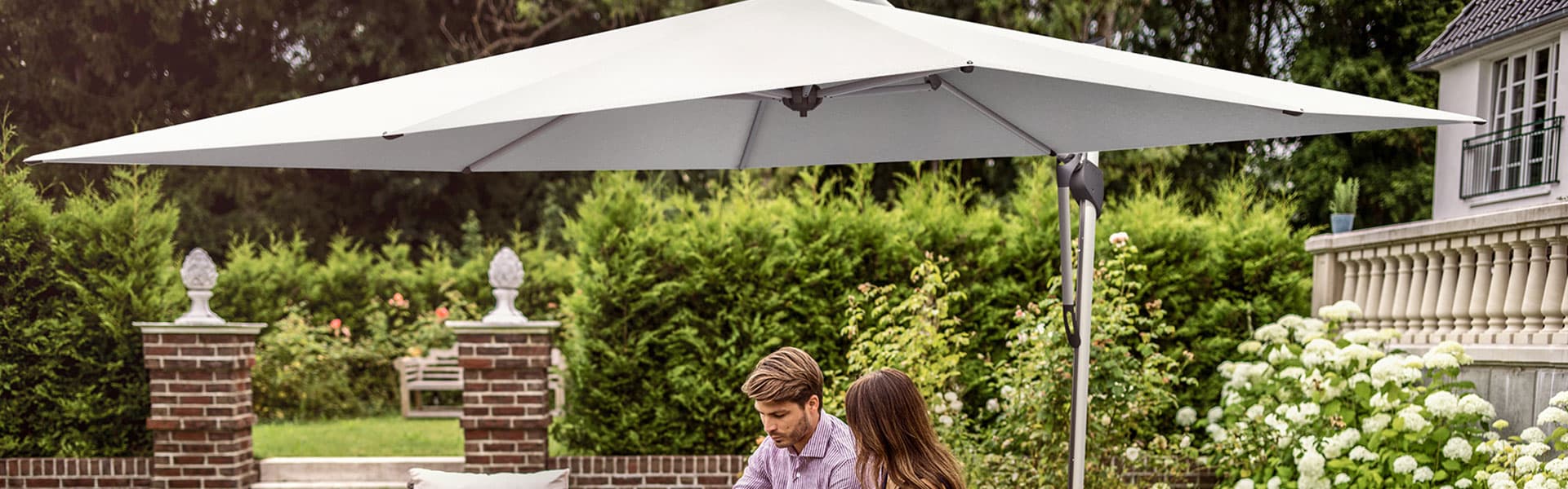 Freiarm- bzw. Ampelschirme sind die Lösung, wenn der gewünschte Sitzplatz keinen Spielraum für zentrierte Aufstellung bietet. Manchmal sind diese Schirmtypen aber auch die erste Wahl, wenn nichts die Sicht behindern soll. Sunwing, Sombrano, Aura oder Fortano bieten für alle Anforderungen Konzepte.