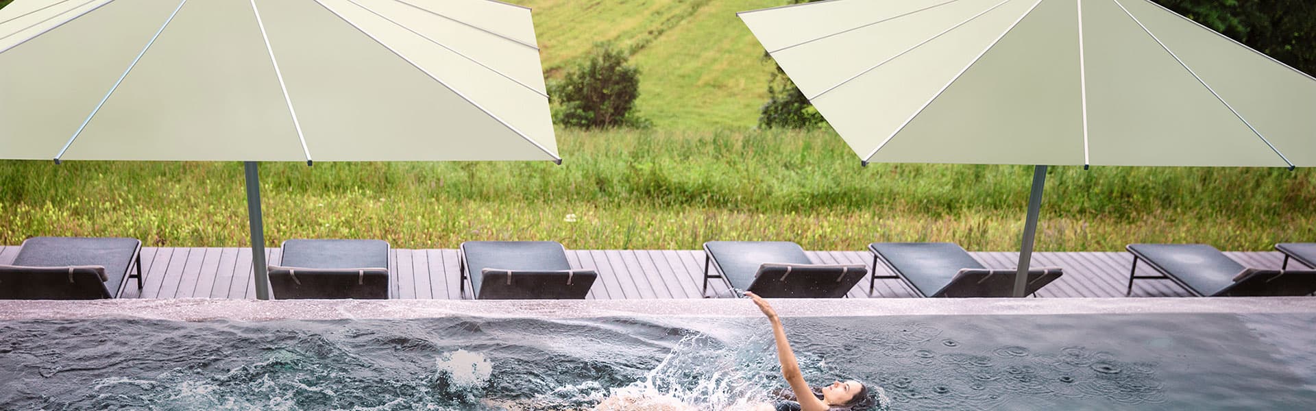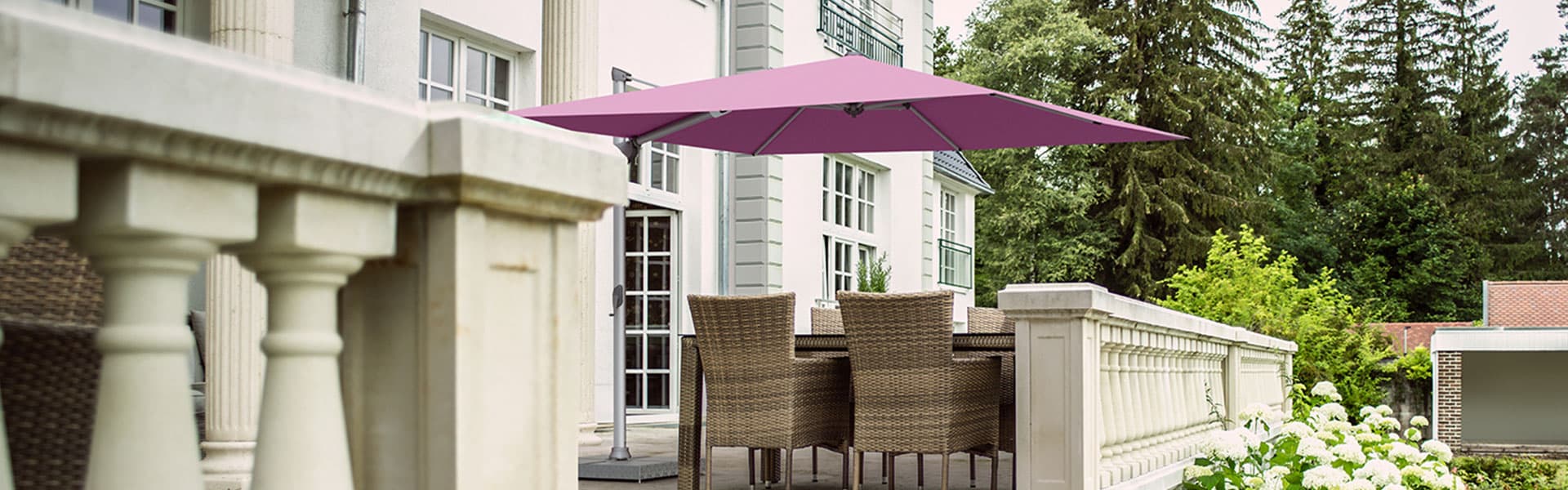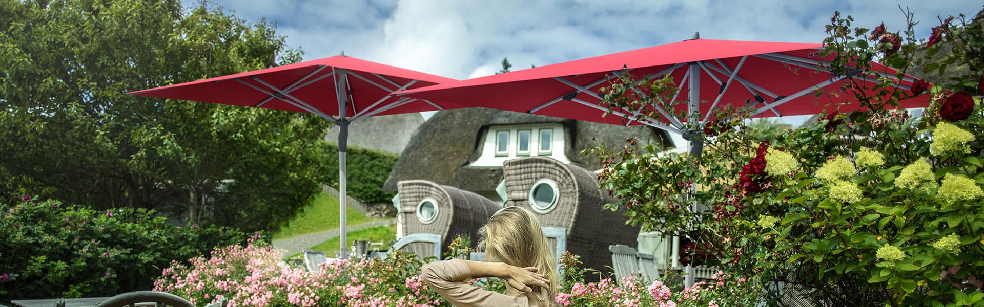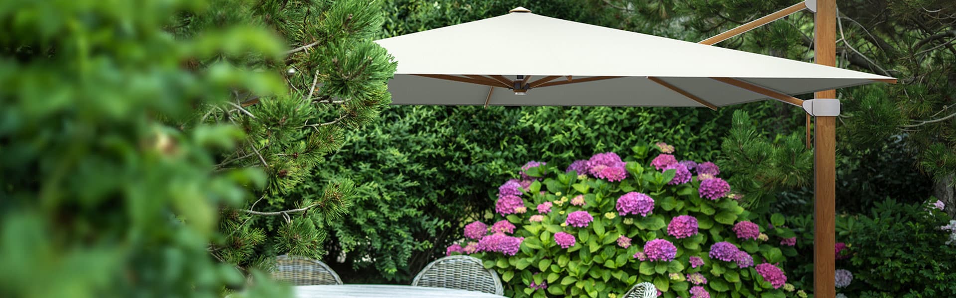 Freiarm- bzw. Ampelschirme sind die Lösung, wenn der gewünschte Sitzplatz keinen Spielraum für zentrierte Aufstellung bietet. Manchmal sind diese Schirmtypen aber auch die erste Wahl, wenn nichts die Sicht behindern soll. Sunwing, Sombrano, Aura oder Fortano bieten für alle Anforderungen Konzepte.