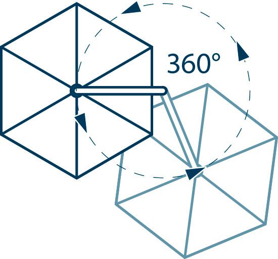 Der Schirmmast ist durch eine spezielle Klemmung um 360° drehbar. Sämtliche Bodenverankerungen sind mit einer speziellen Klemmung ausgestattet. Dadurch können Sie den Schirm rundherum nach der wandernden Sonne drehen.