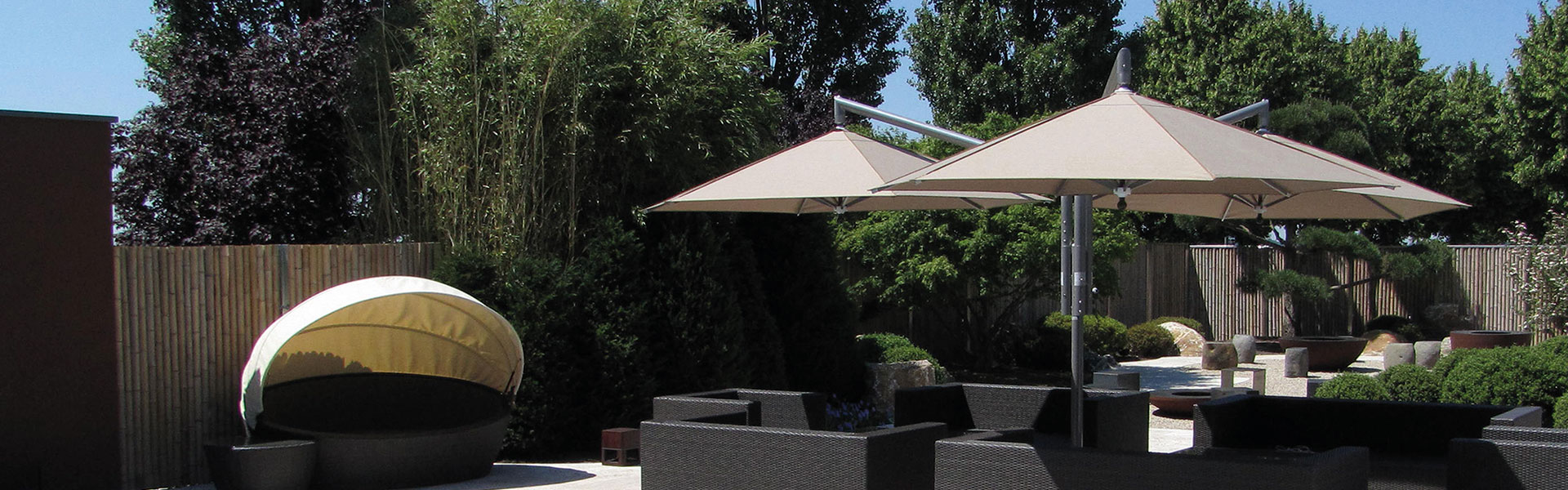 Speziell für großflächige Außengastronomie zugeschnitten ist die Beschattung mit Schirmgruppen. Durch den stabilen Mast kann der Rialto mit bis zu 4 Schirmdächern bestückt werden. Diese Gruppierung ist ein echter Blickfang für die besondere Terrasse.