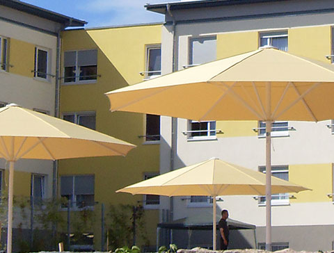 Bis zu 78 m2 Schatten mit dem Großschirm Albatros von May oder freistehende Markisen mitallen Anordnungsmöglichkeiten.